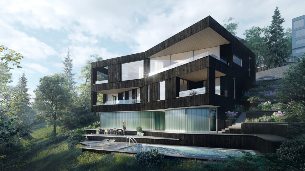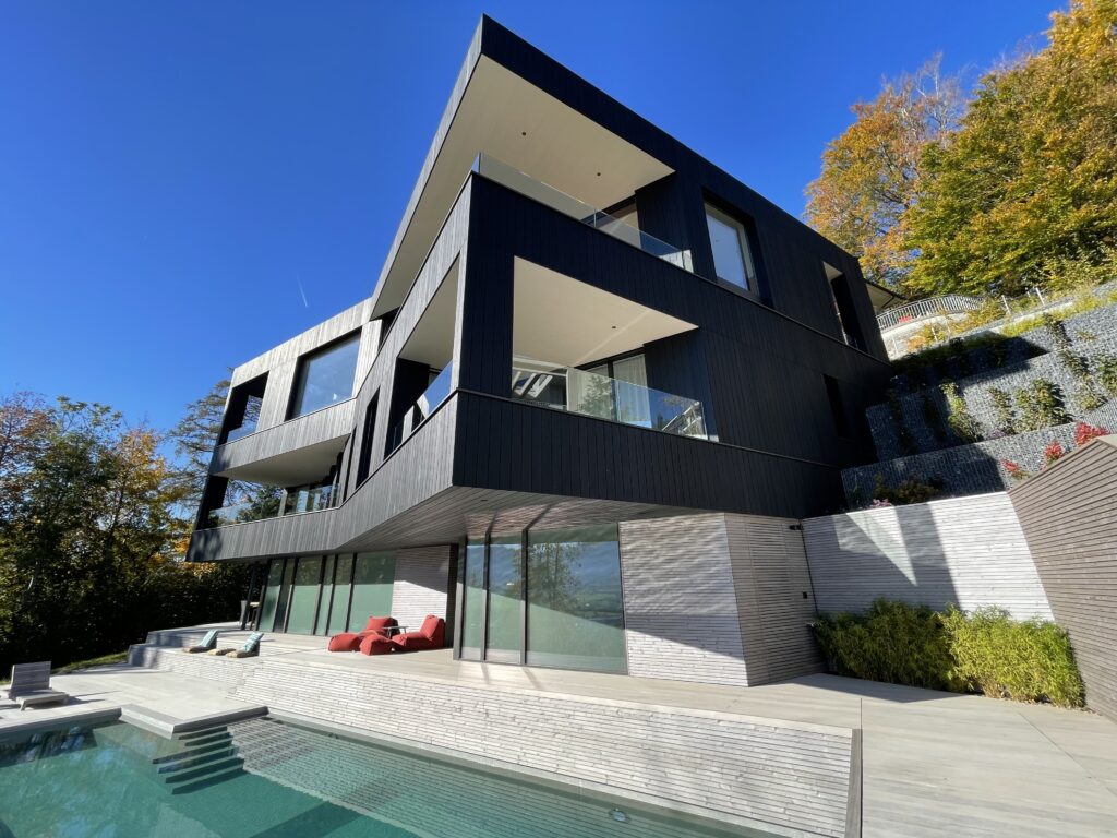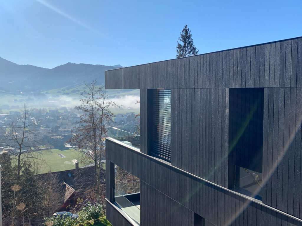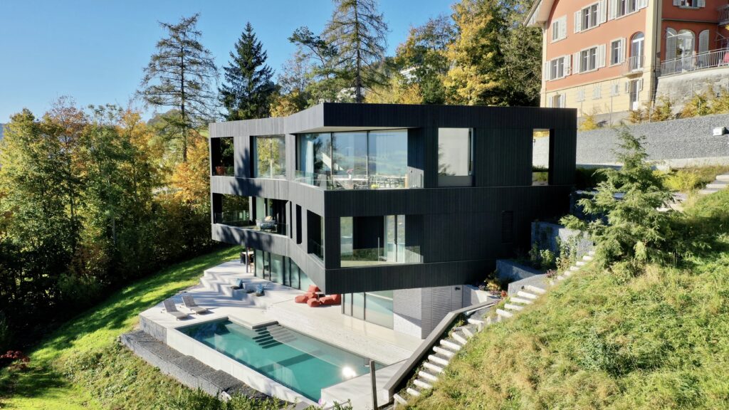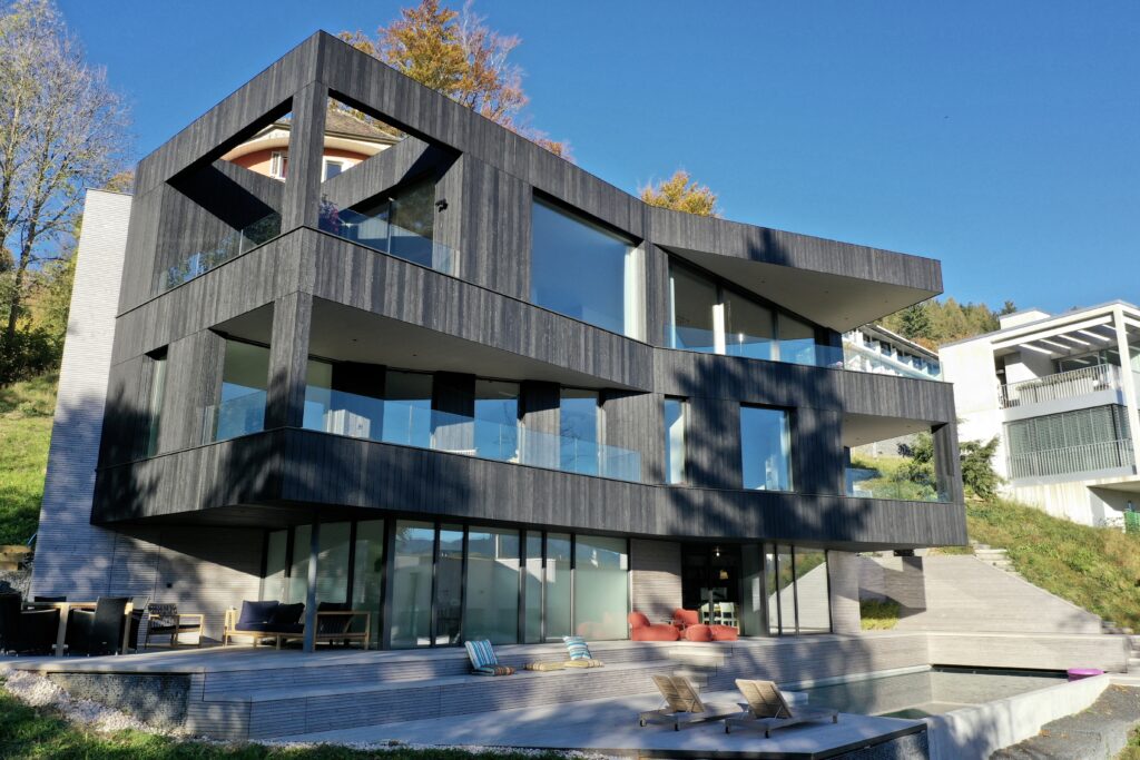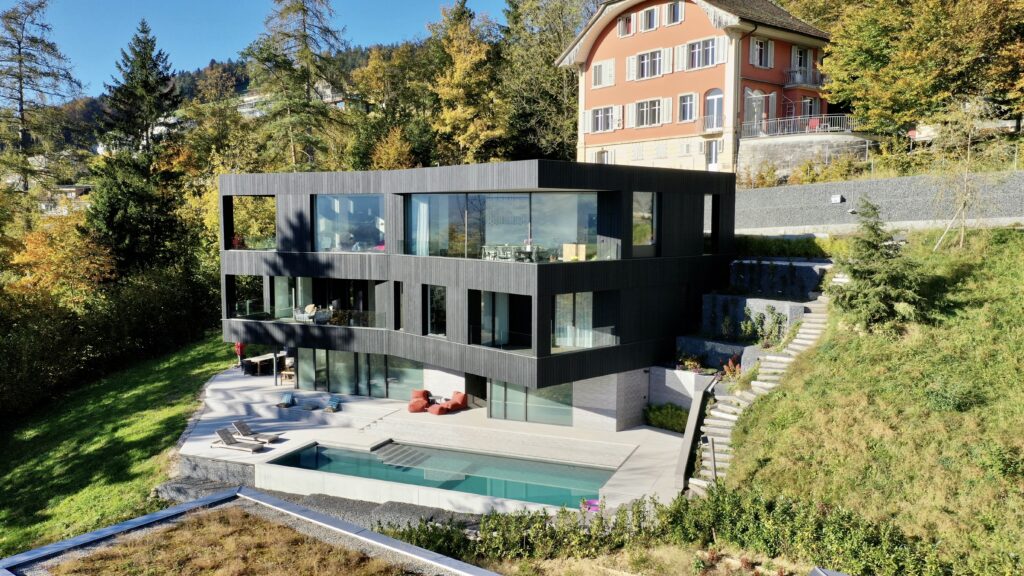A large family villa for Kinth partner Alkis Tzavaras was built in an idyllic setting in canton Zug, using the latest environmental and sustainability standards and techniques. Achieving Minergie P standard and operating as a passive house, the building is prefabricated timber clad in a distinct charred accoya. Ground source heat pumps, large solar arrays and batteries, and water retention give the ability to be fully self sustaining.