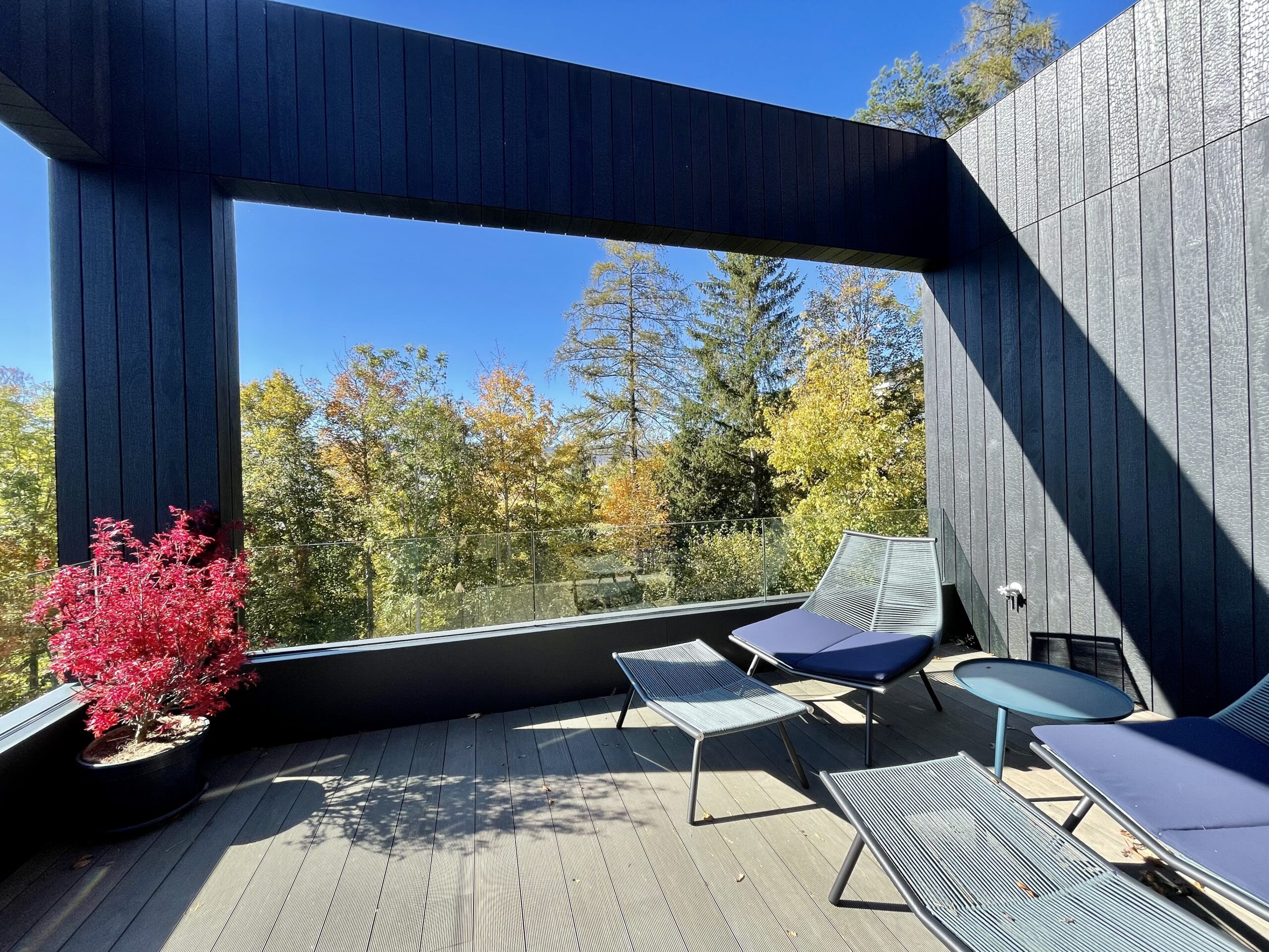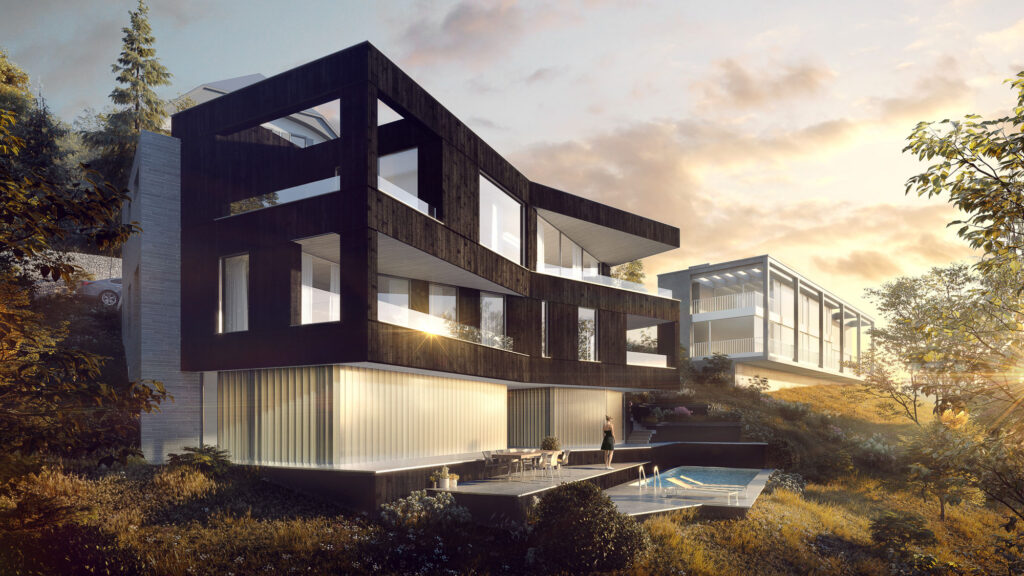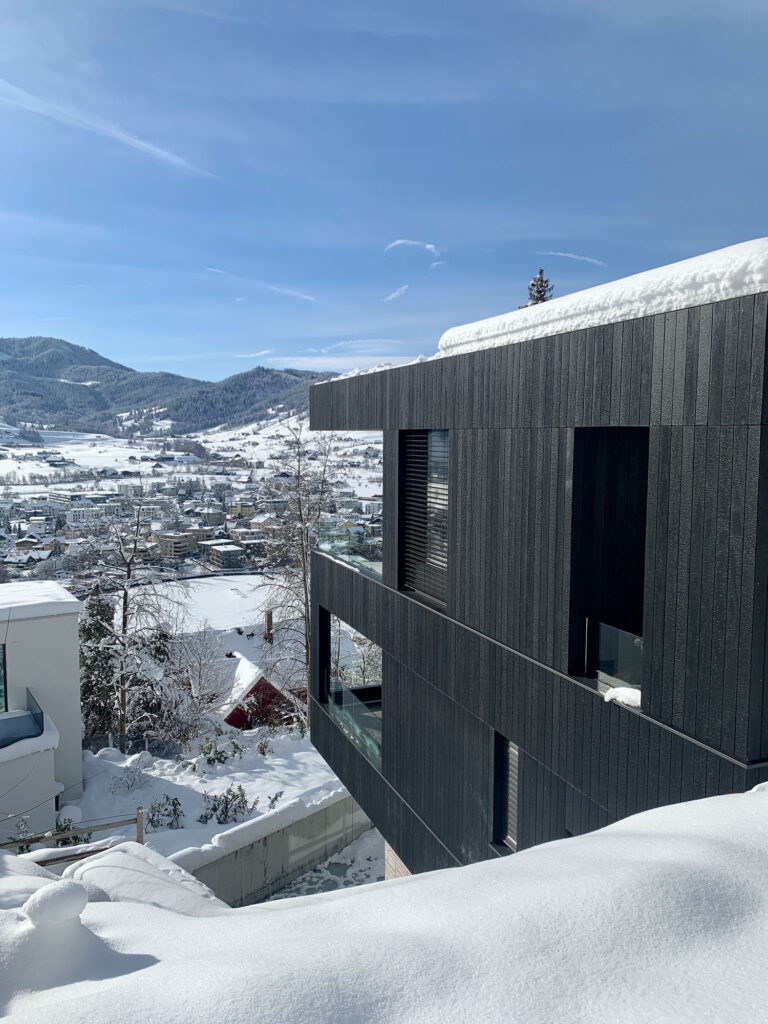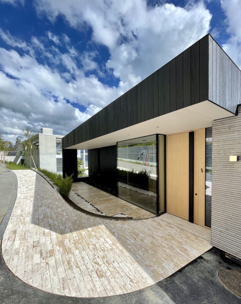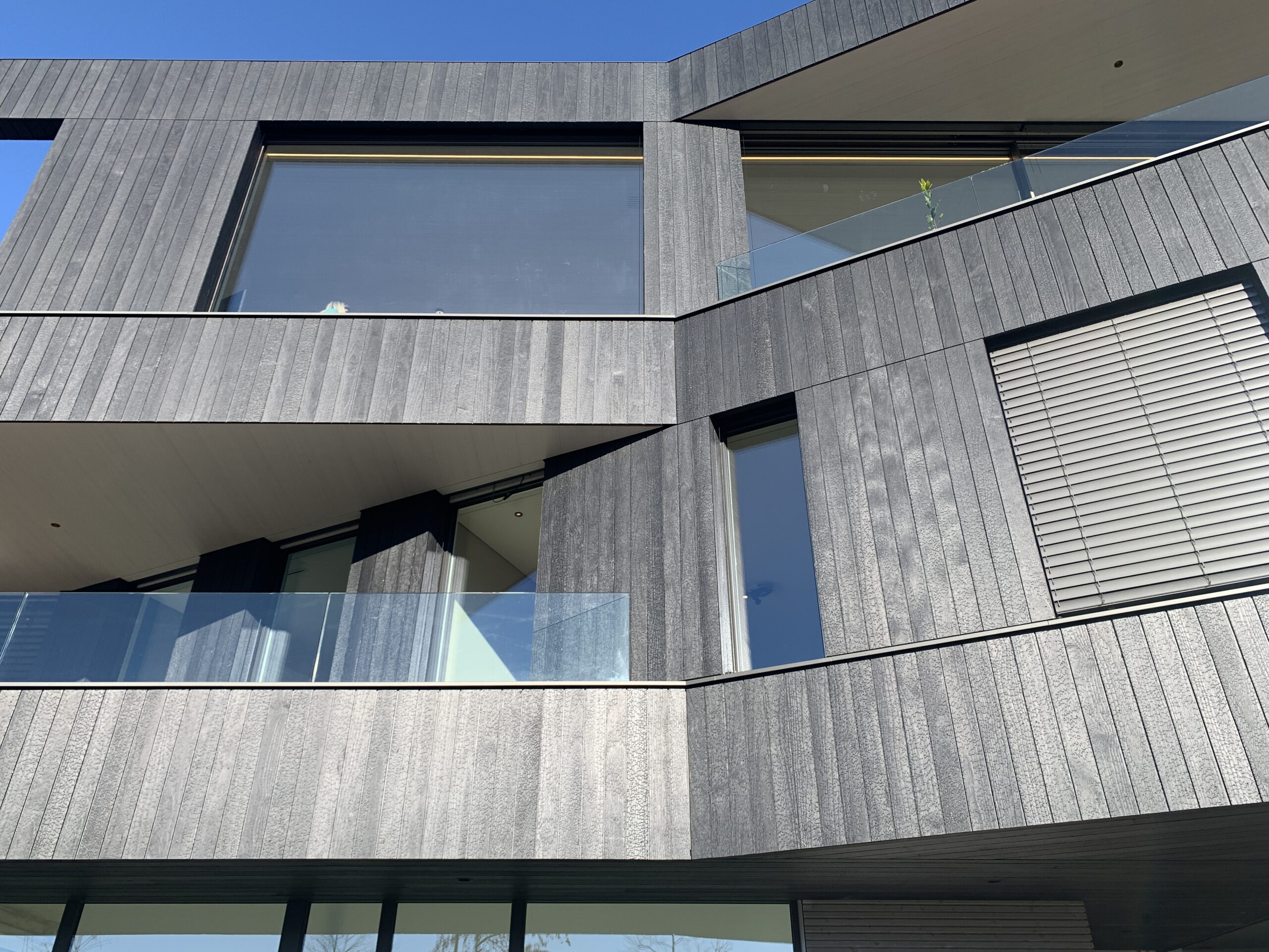 A large family villa for Kinth partner Alkis Tzavaras was built in an idyllic setting in canton Zug, using the latest environmental and sustainability standards and techniques. Achieving Minergie P standard and operating as a passive house, the building is prefabricated timber clad in a distinct charred accoya. Ground source heat pumps, large solar arrays and batteries, and water retention give the ability to be fully self sustaining.